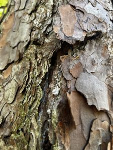 And then, about half way along this wandering, remembering walk, I suddenly grew very tired. Almost overwhelmingly fatigued. The old pain was creeping back. So I stopped to rest against a nearby tree – a beautiful old pine with a mottled coat and a bend just right to cradle me as I leaned against it. And I turned my head to press my ear against its barky skin, to listen to its inner rhythm and flow of life. And there, just inches from my eyes, was a tiny sparkling droplet, like a single tear … and then another … no bigger than a fairy’s finger tips. The tree had shared two tears with me and left them glistening in the sunlight … just there … just where I would see them and understand.